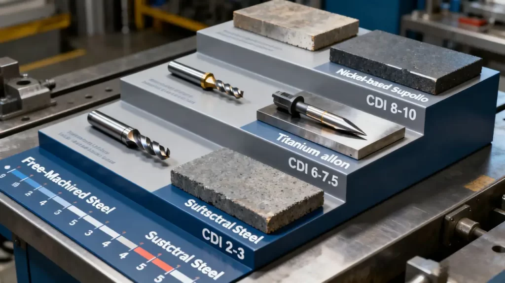 The industry-standard Cutting Difficulty Index (CDI) provides a quantitative framework for evaluating the demands placed on CNC machine tools across material classes: