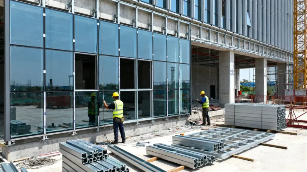 Curtain walls are non-structural exterior cladding systems that hang from a building’s floor slabs or frame. They carry only their own weight and resist wind loads—but do not support the building’s structural load. This allows architects to use large glass panels, complex geometries, and lightweight materials like aluminum.
